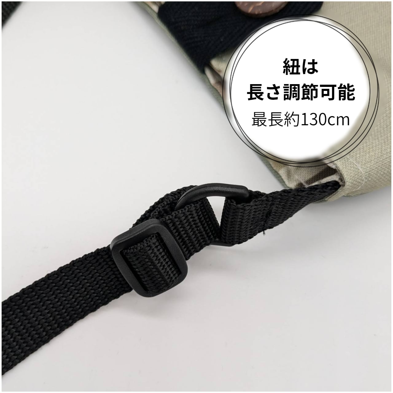 紐の長さは最長約130cmまで調整可能で、斜め掛け・肩掛けどちらでもご自身に合ったスタイルでお選び頂けます。