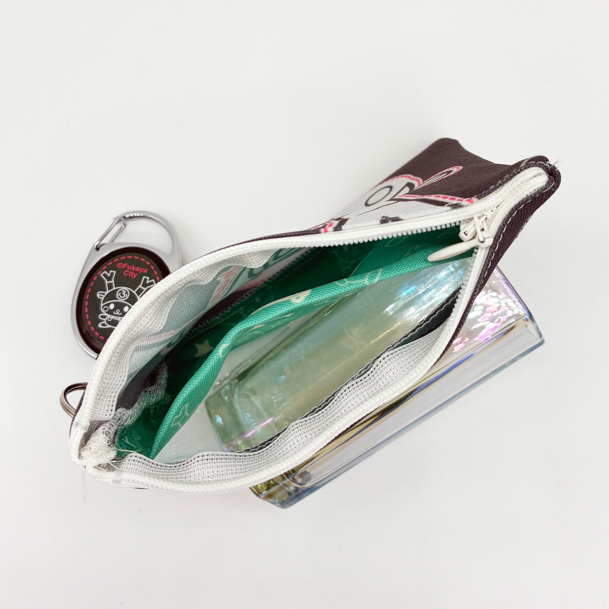 表はアップリケ風のふっかちゃんのプリント。裏はビニール生地になっていて中身が一目でわかります!様々なポーズのふっかちゃんと一緒に、ネギや乗り物が散りばめられた楽しいデザイン。