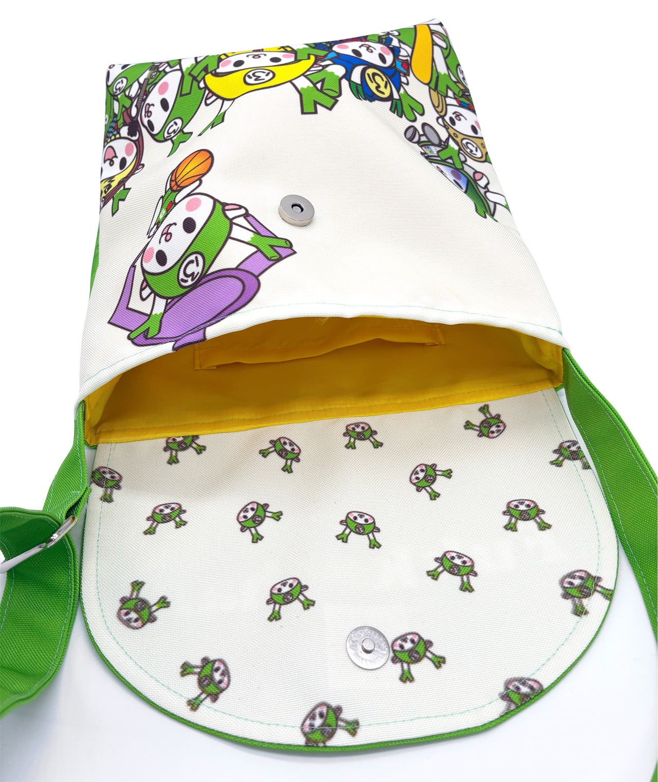 フラップを開ければ、そこにはイエローの内生地と、さらに可愛いふっかちゃん柄が広がります。表も裏も、どこを見てもふっかちゃん。内ポケットも付いているので、スマホや鍵の整理にも便利です。マチ付きで収納力も抜群。マグネットボタンで開閉もスムーズです。パッと目を引く、元気いっぱいなショルダーバッグです。