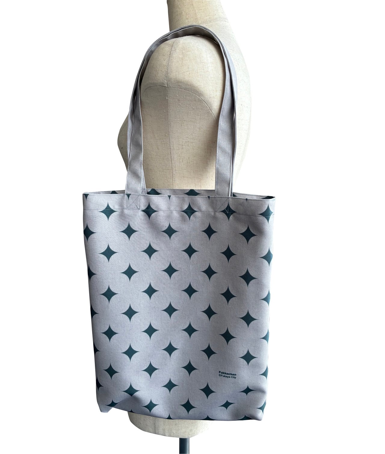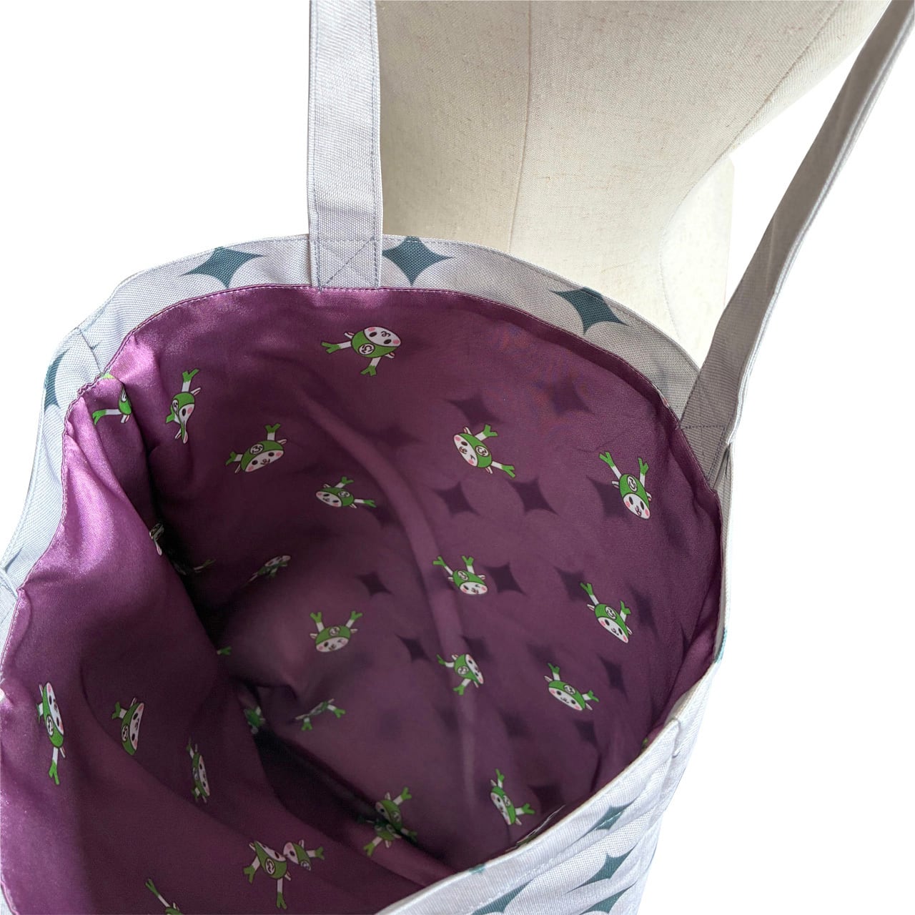 バッグを開くとパッと広がる鮮やかな裏地が魅力です。外側は控えめに、中はふっかちゃんをふんだんに散りばめた遊び心溢れるトートバッグです。