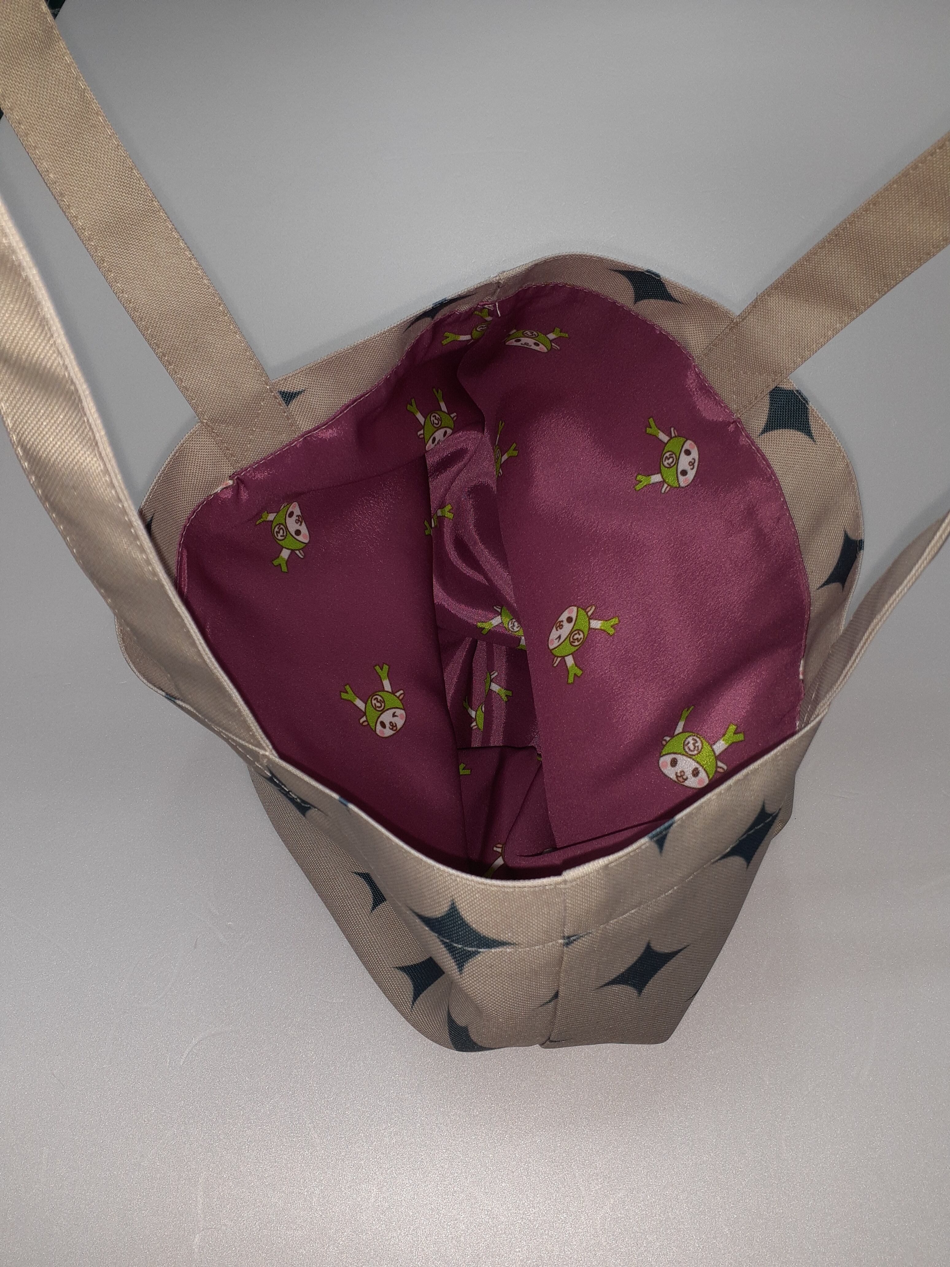 バッグの内側に裏地がついたふっかちゃんトートバッグです。キラキラ柄の中に1つだけ隠れふっかちゃんとして、ふっかちゃんが紛れてます。