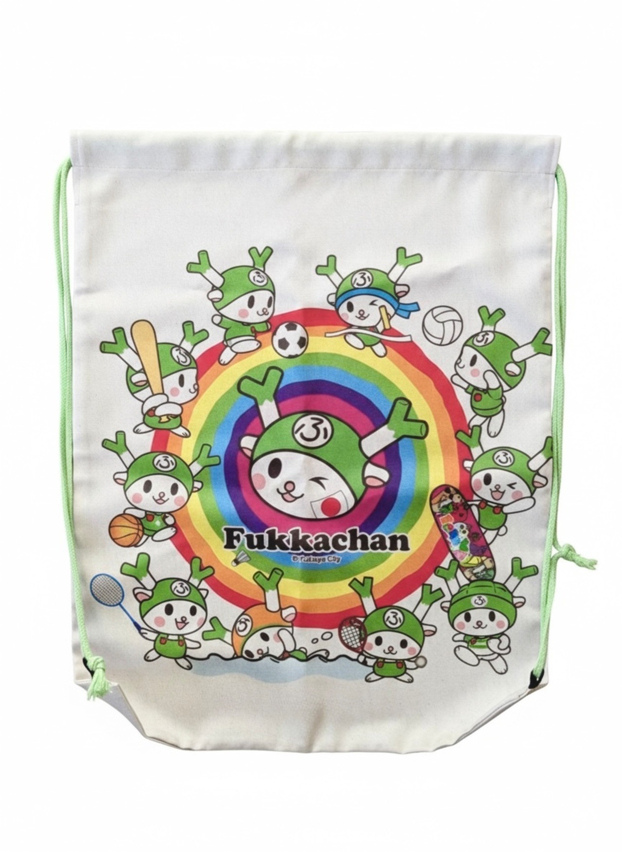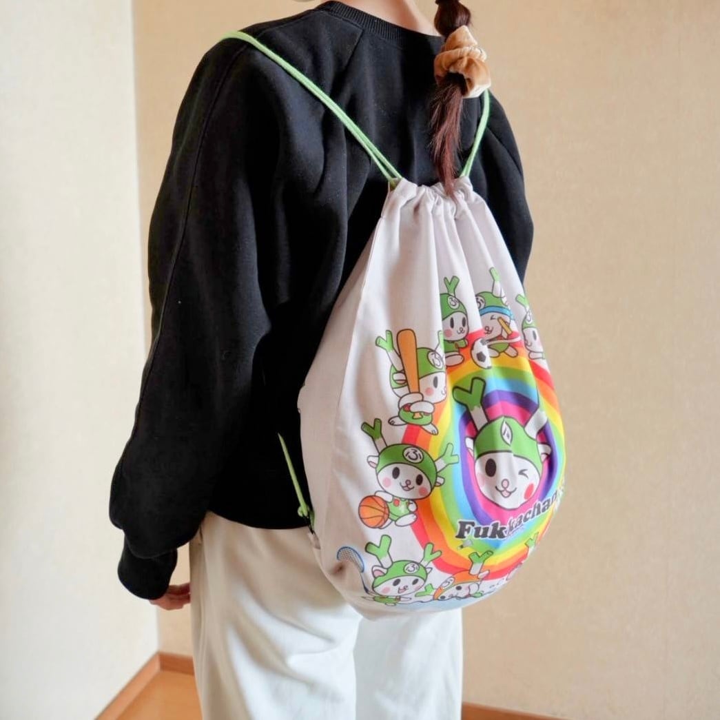 虹をバックに、サッカーや野球、水泳などを楽しむふっかちゃんが全面にプリントされた、見ているだけで元気がもらえるデザインです。部活動やジム、習い事のサブバッグとして大活躍!体操着、シューズ、タオルなど、身の回りのものをたっぷり収納。軽量で、使わないときは小さく折り畳めます。